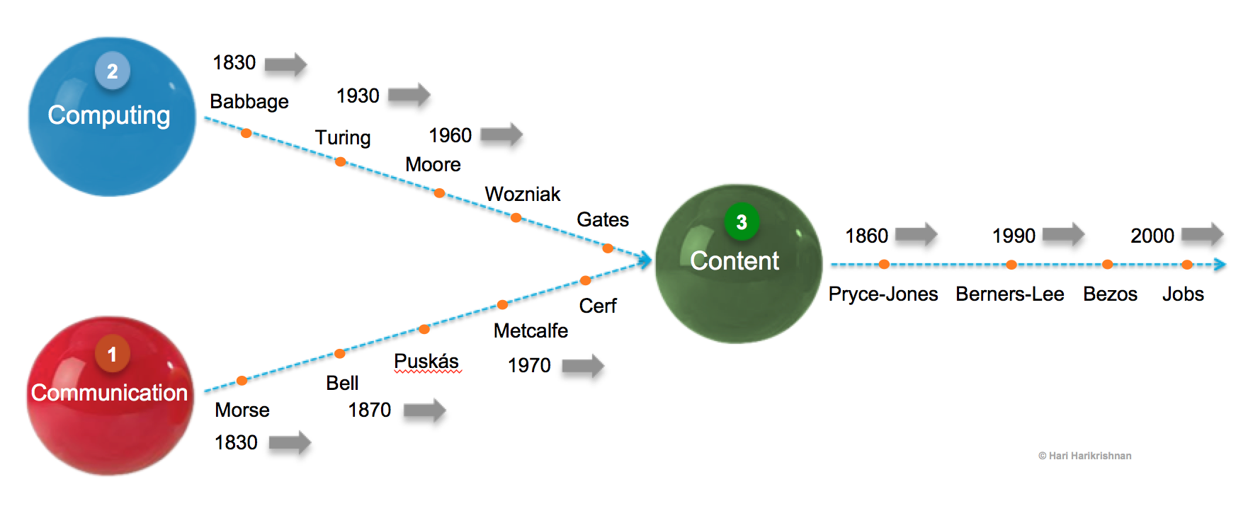 Let’s get past the superficial and dig for more history on how we got here. The picture below shows the historical evolution of couch computing over the last two centuries on 3 axes — communications, computing, and content delivery. Each axis depicts eras and names of inventors, influencers, or the main protagonists of the technologies or business models.