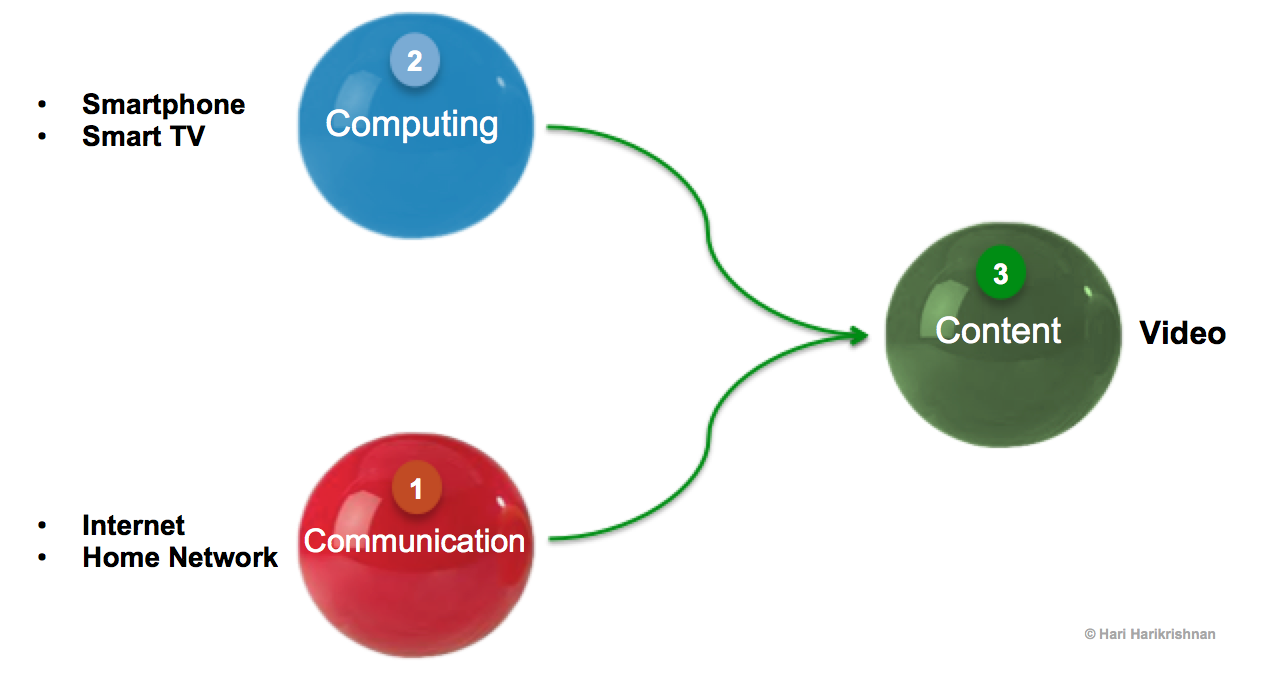 How did we get here? And that too, in a seemingly short time? Cloud aficionados will say it is all due to the cloud. Smartphone fans will attribute all this convenience to these versatile handhelds. There is truth in both, but there is more. It is a journey through time on multiple technology trends, computing technologies and telecommunication technologies being the primary ones. How they have been mashed together to deliver content in various forms resulted in my couch computing. A superficial look at the 3 Cs of Couch Computing that combined to deliver my entertainment is shown below.