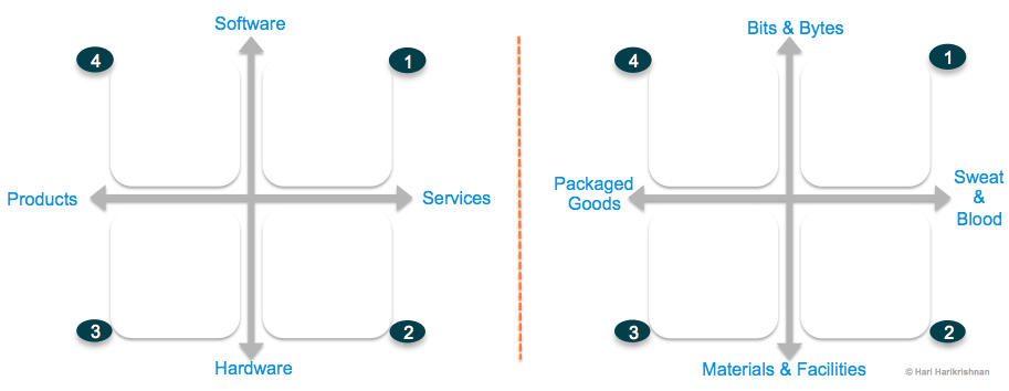 When firms generate revenues from services, software, or hardware, they are packaging value created from a combination of people & processes (“sweat & blood”), software (“bits & bytes”) or hardware (“materials or facilities”) and selling it under different covers or skins as shown below.