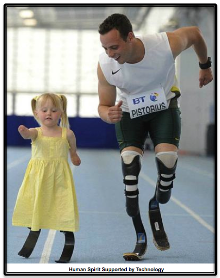 So what has all this got to do with Oscar Pistorius anyway? This inspiring and indelible image of Pistorius racing an adorable little girl captures in a nutshell what service (people) assisted by technology has in store for humanity — a world of diminishing impossibilities.