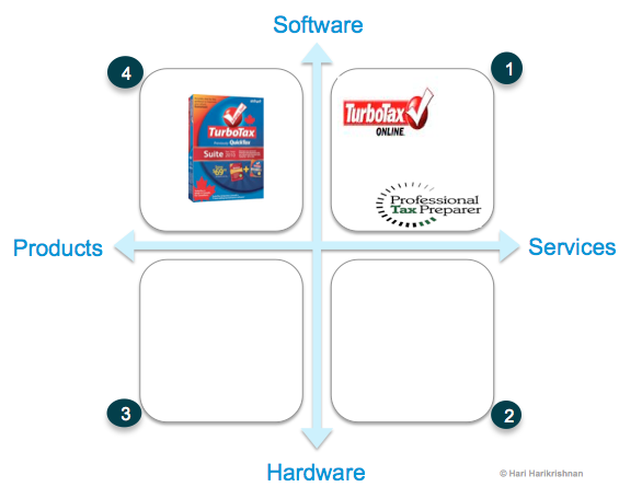 Using tax preparation software instead of using the services of a tax preparation professional or  eliminating some manual do-it-yourself (DIY) tax preparation work happened mostly in the 90s. We replaced the services of humans partially with software (see the move from quadrant 1 to quadrant 4). Then Intuit made it easier by offering an online version of that software (see the move from quadrant 4 back to quadrant 1). While the online version eliminated the Buy-Install-Use-Update cycle of packaged software, it still seemed software and hence not such a big leap as replacing a professional with software. So is SaaS really software first and service afterwards? It would appear so.