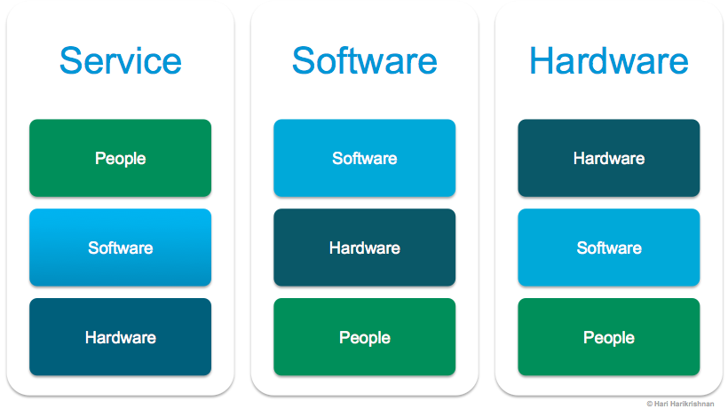 Today, most services that combines people and processes are powered by software and hardware. The AT&T technician who came to my house to troubleshoot a TV problem  used his expertise aided by a diagnostic software running on an iPad, as depicted on the left stack in the picture above. (My local handyman perhaps is still unaided by software, but still dependent on his favourite DeWalt hardware!). On the stacks above, you can see how a software offering is built on hardware and people, whereas a hardware offering is built on software & people, as neither software or hardware are useful in isolation.