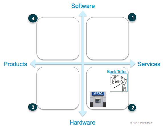 Teller service in banks too went through a technology change in the last few decades. We have all taken it for granted now. Teller machines (ATM) have successfully made 24×7 banking service possible. Another example of technology replacing humans to provide a service (see the placement of these services in quadrant 2, indicating the move from a service based on people & processes to a hardware-based service). So what distinguishes service from technology, if anything?